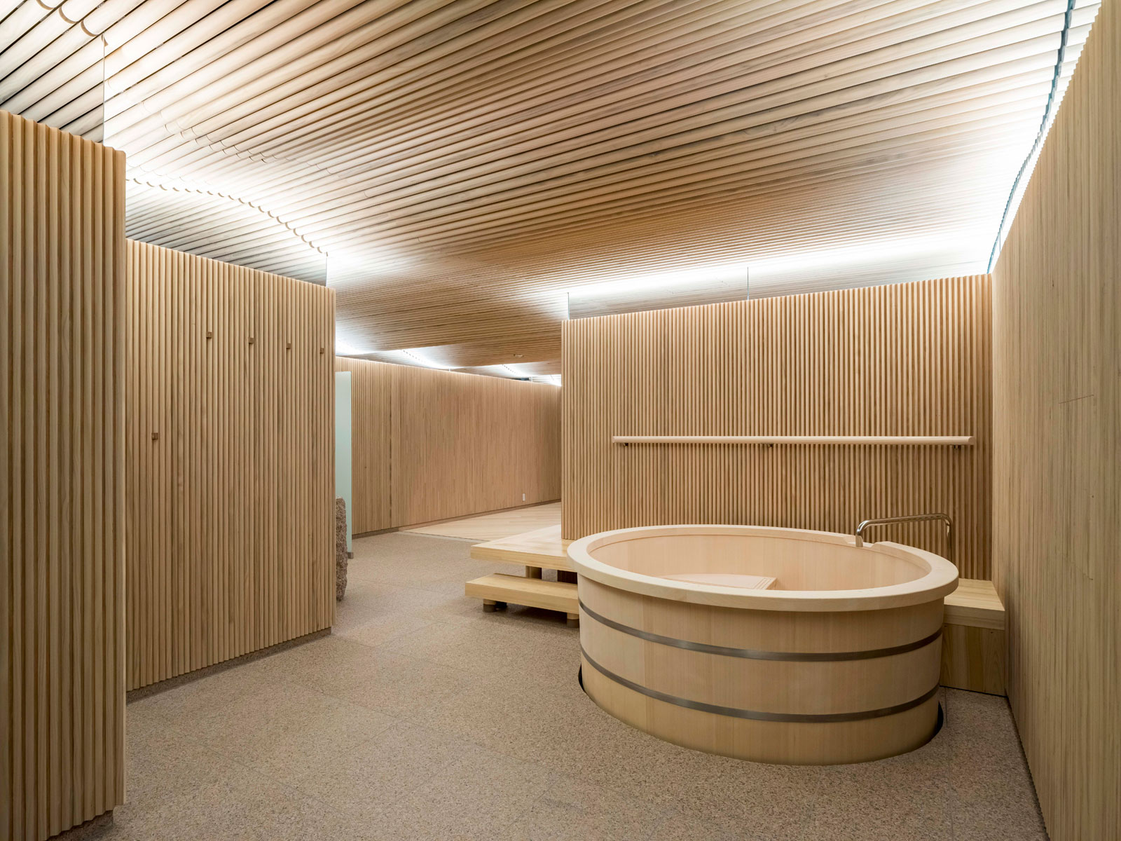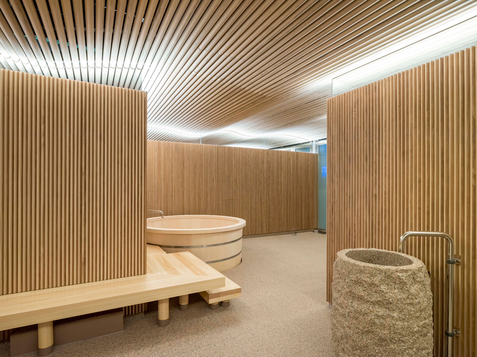 タマディック名古屋オフィスビルのサウナ施設で、リラクゼーションエリアの壁と天井にアコヤ材が採用されました。