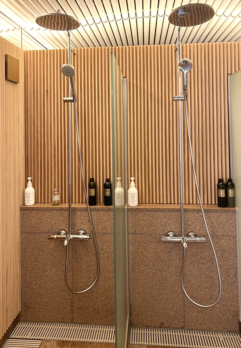 シャワーや洗面、水風呂を備えたこの空間は、湿度や温度がたびたび変化しますが、アコヤは反りや割れを抑え、寸法の安定性を発揮します。