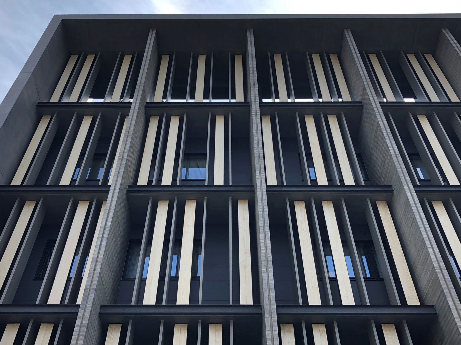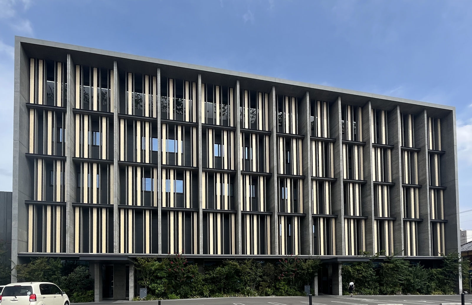 高所に設置される病院の外壁ルーバーには、定期的なメンテナンスが難しいという課題がありました。そこで選ばれたのがアコヤ材です。