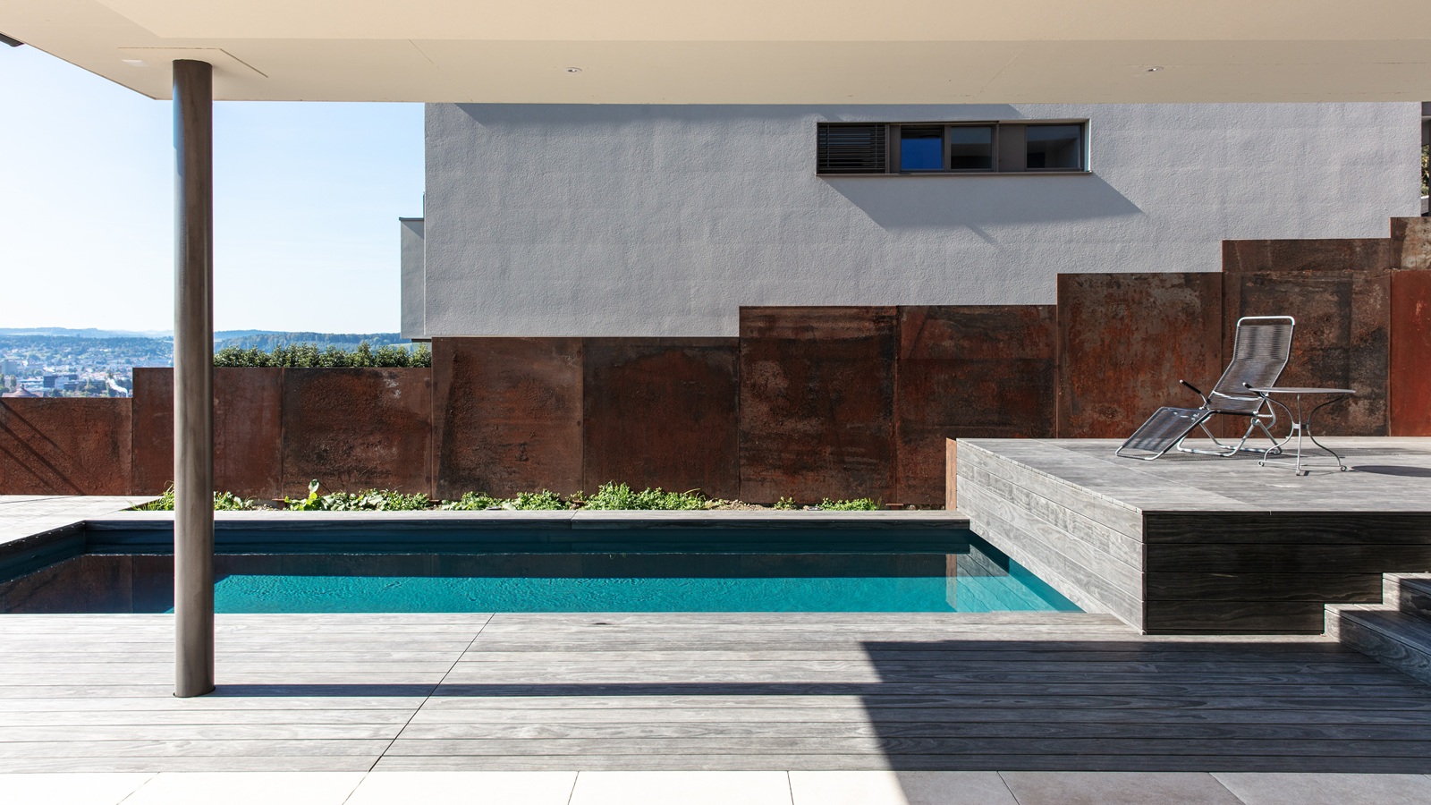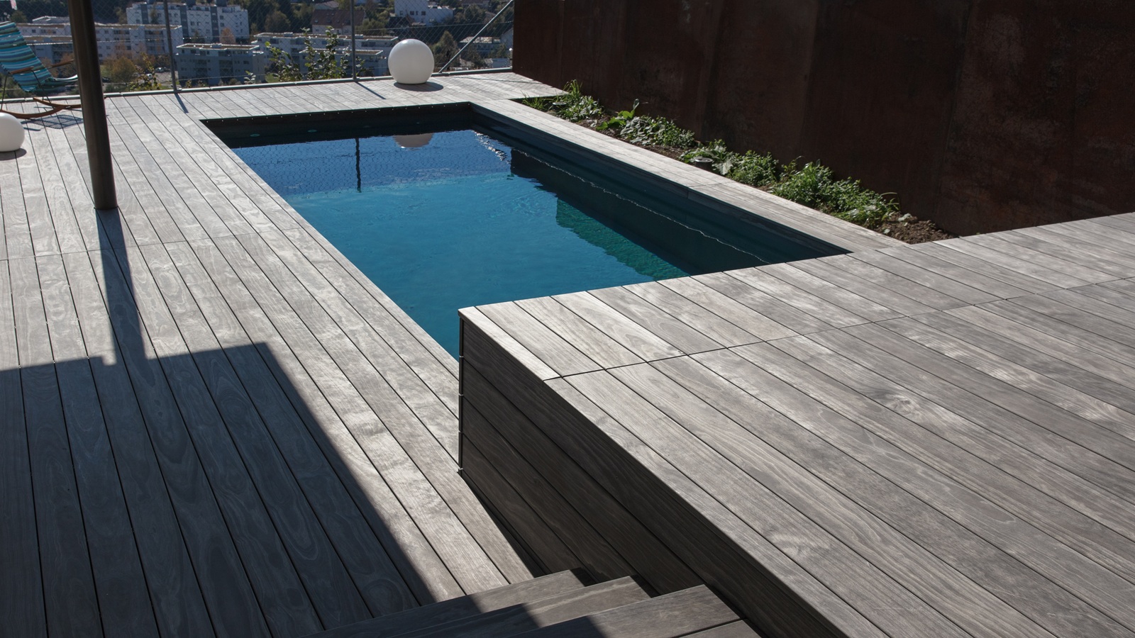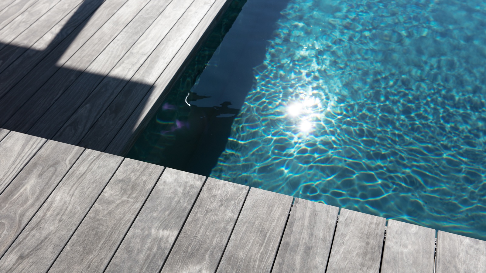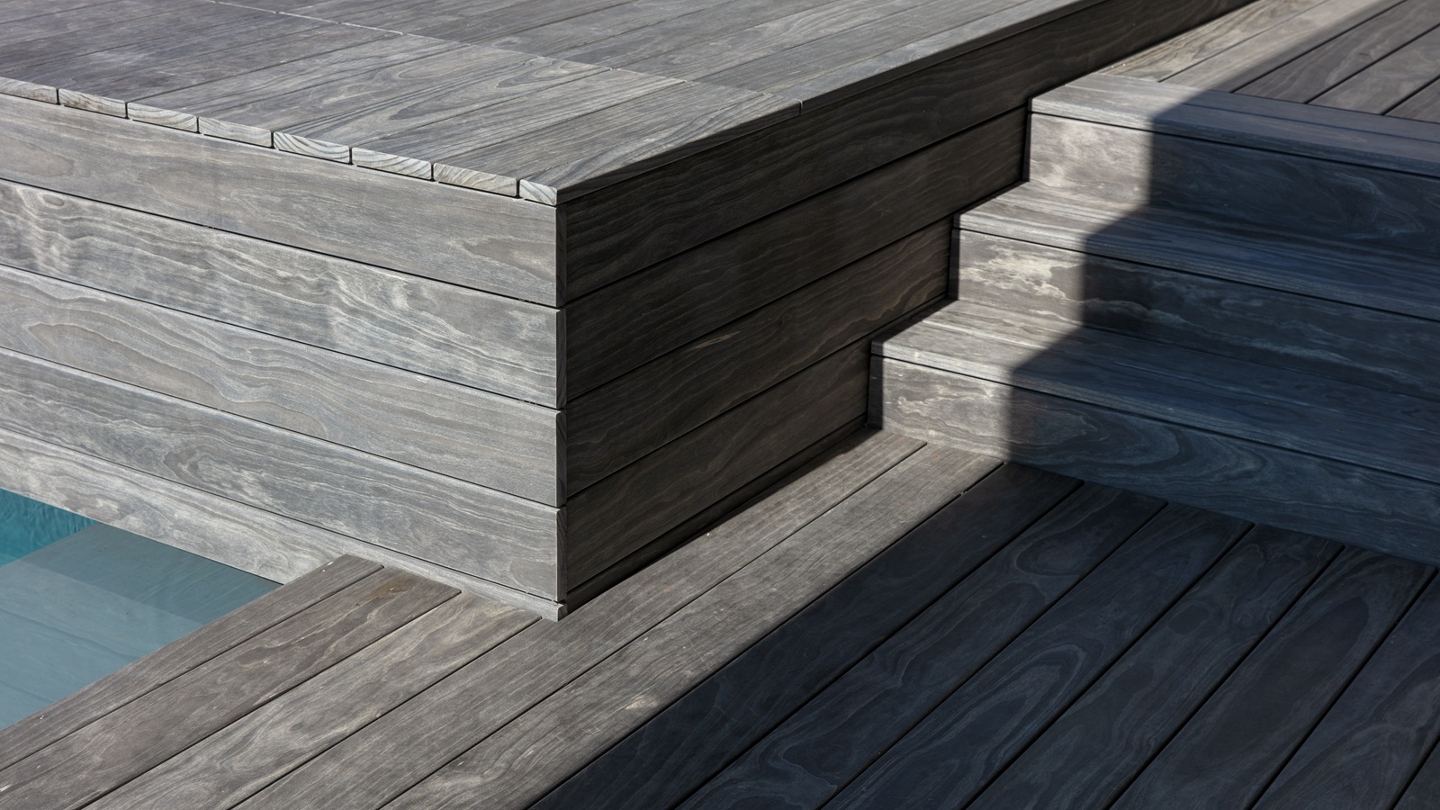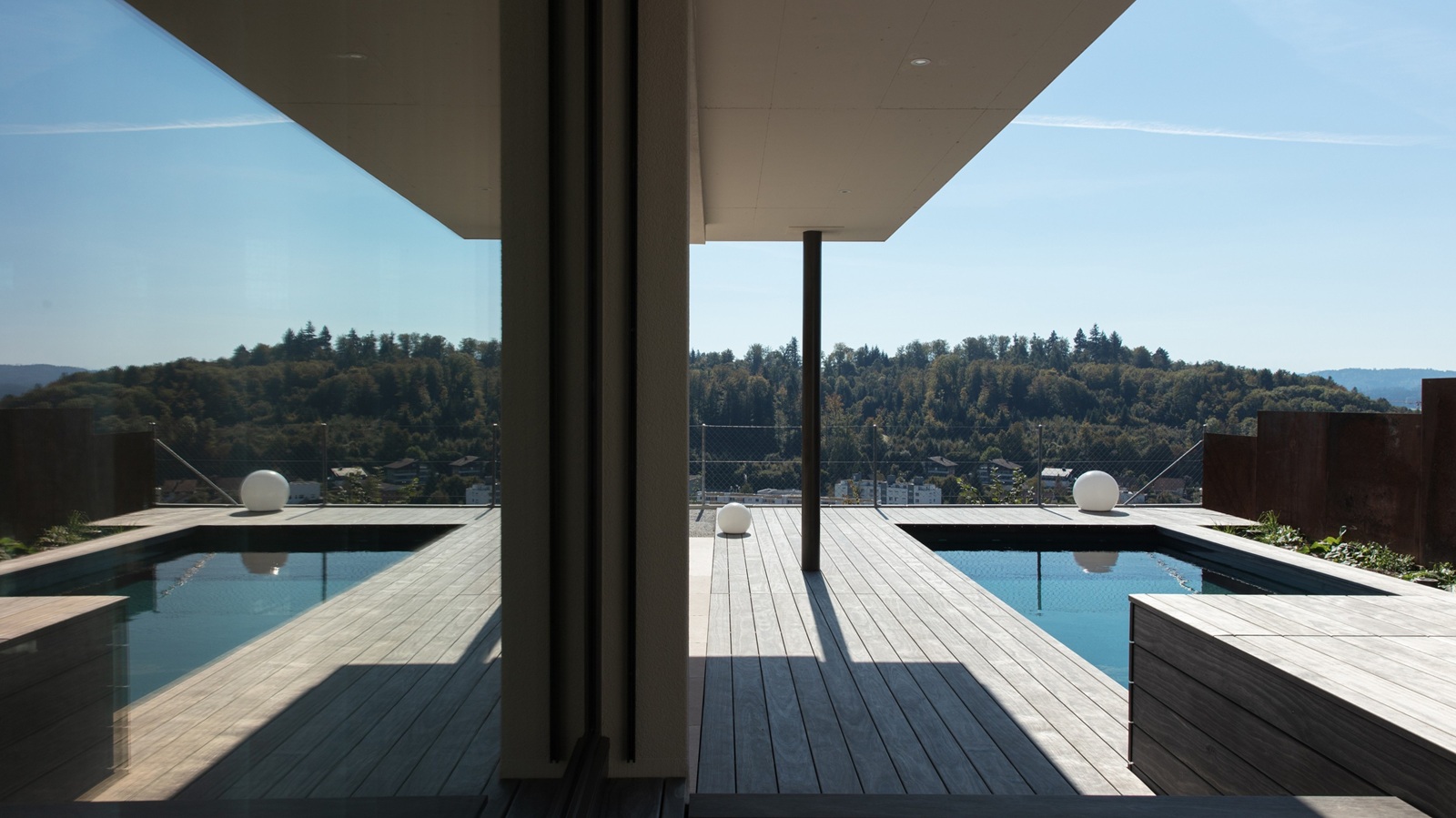 このスイス山間部の邸宅では、プールを囲むデッキにアコヤグレーが採用されています。建物からプールへと続く伸びやかな設えが、周囲との美しい調和が印象的です。