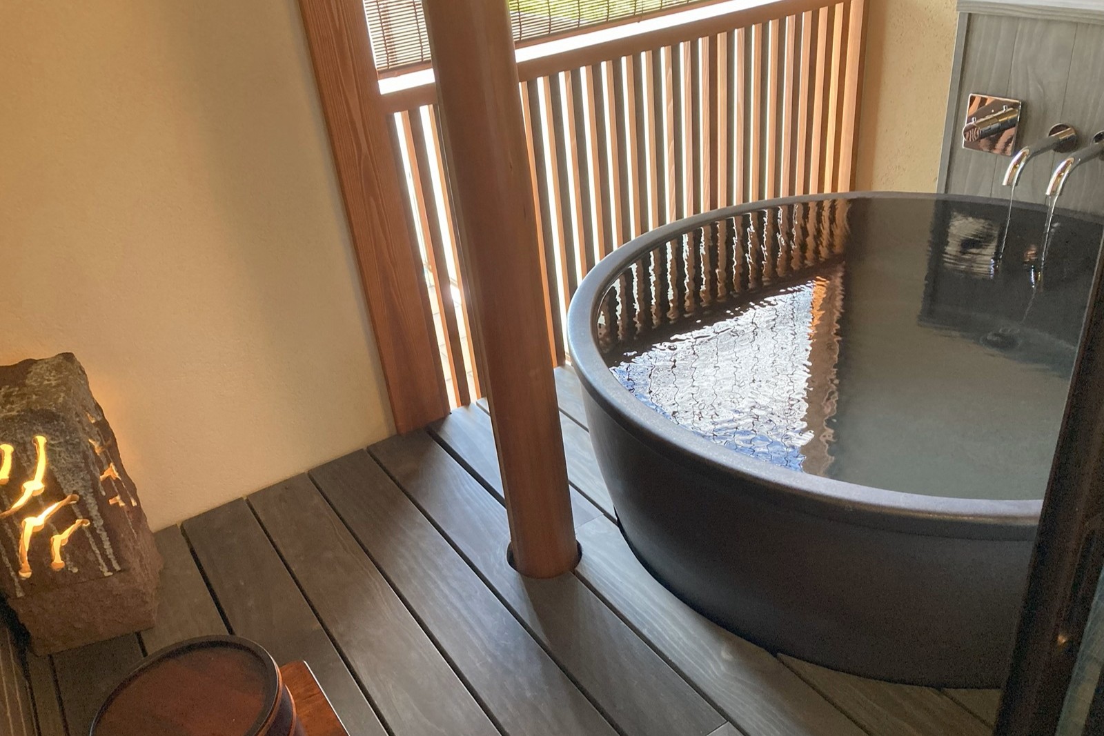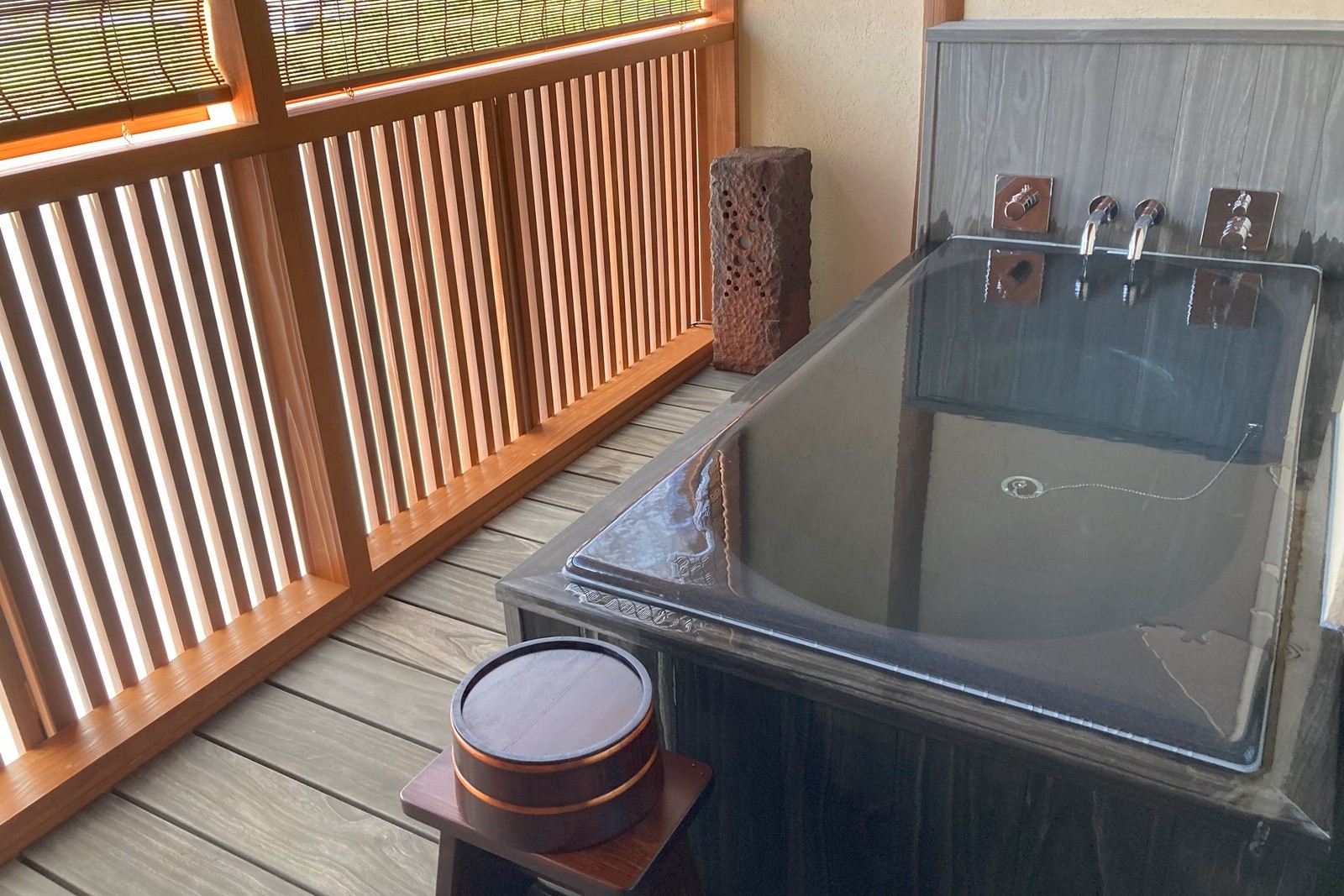 島根県の温泉旅館「玉峰山荘」の特別客室では、源泉掛け流しの半露天風呂エリアに アコヤグレーが採用されています。落ち着いたグレーの色合いが湯けむりの空間をやさしく包み込み、木と湯、そして自然が織りなす静かな調和を引き立てています。