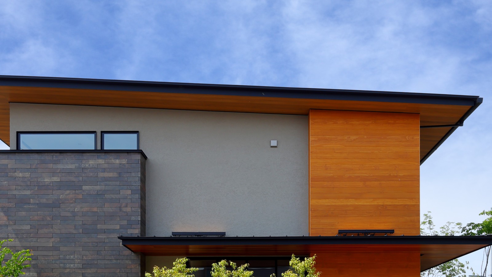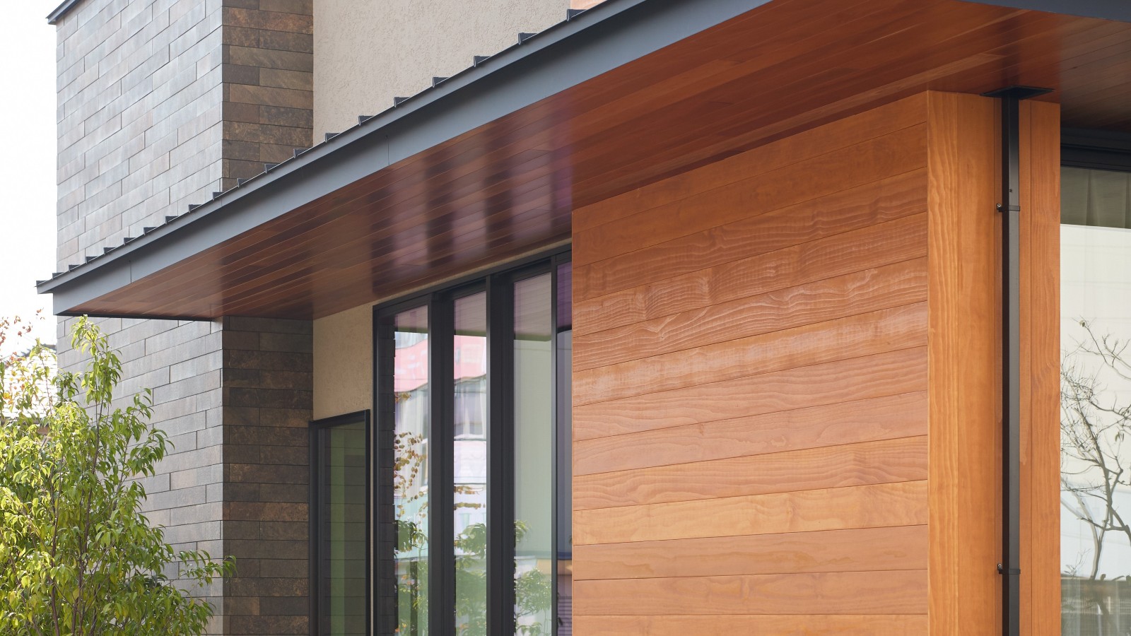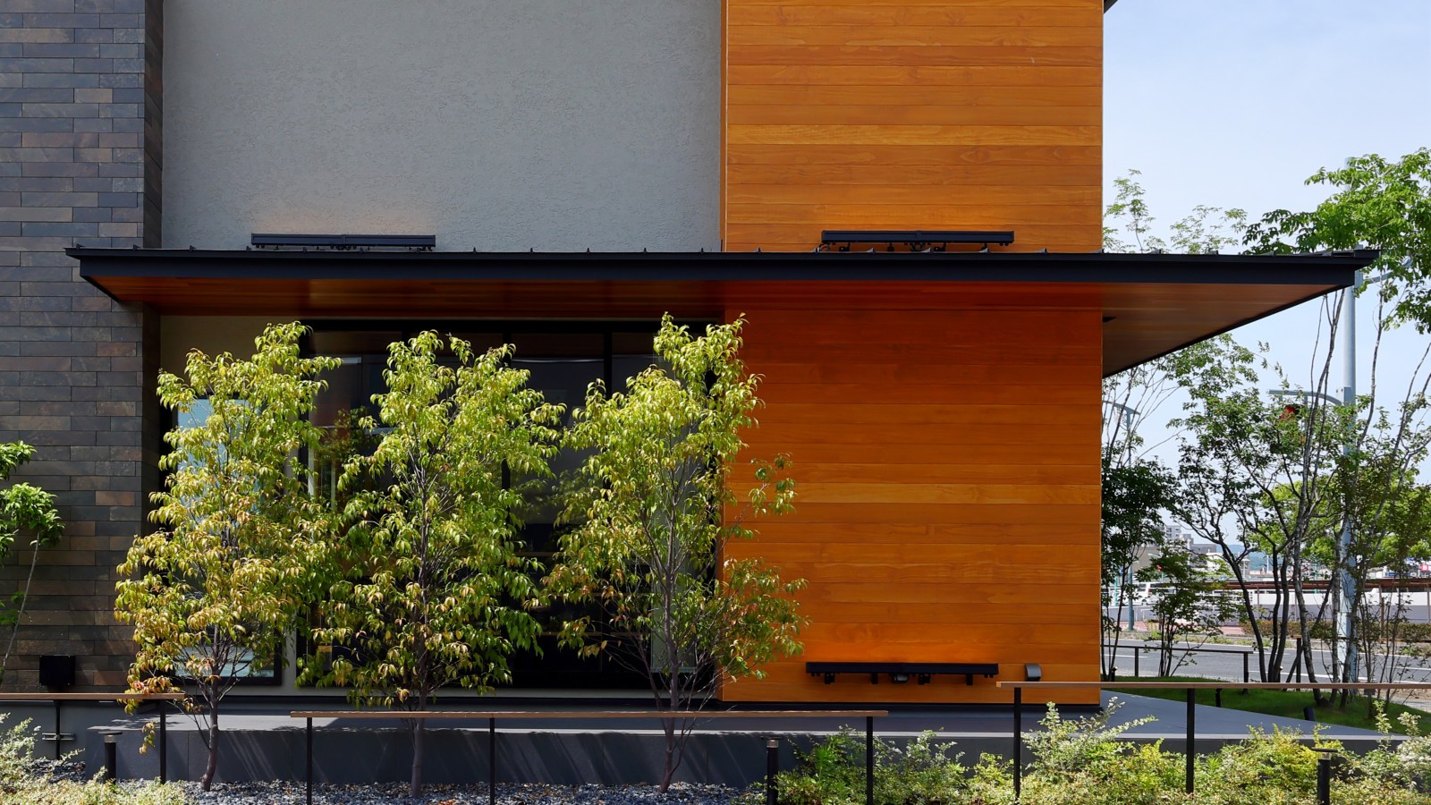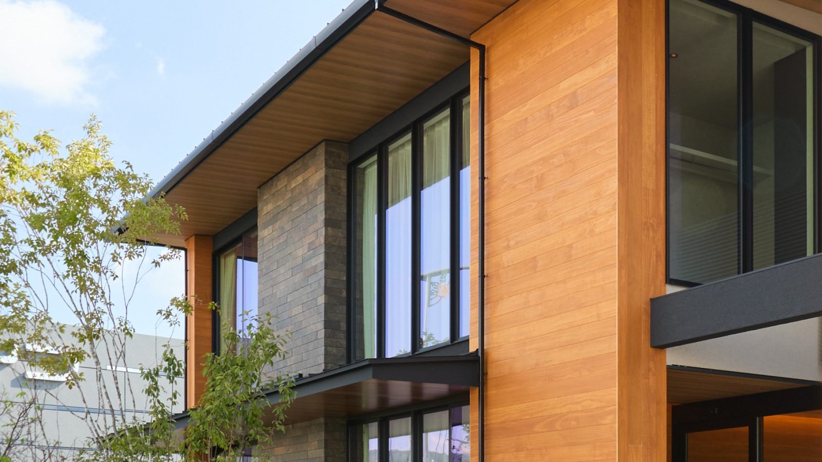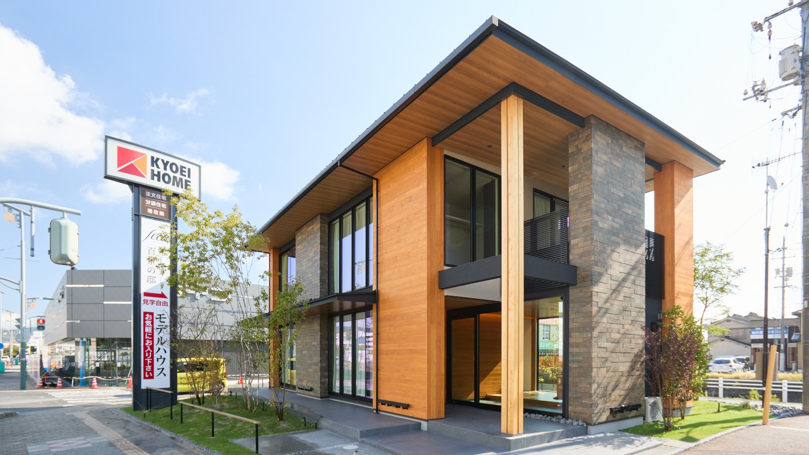 広島県福山市に拠点を構える共栄ホームの入船展示場の建て替えに際し、外壁材としてアコヤをご採用いただきました。家具工場を持つ同社ならではのこだわりとして、「本物の木を外観に活かしたい」という思いからアコヤを選定。耐久性の高さが決め手となり、木調サイディングではなく天然木にこだわった選択です。